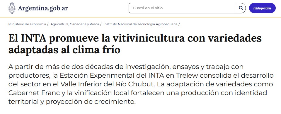 Sin embargo, en el sitio de difusión de la información nacional se coló un interesante informe sobre la utilidad del INTA: habla de su rol clave en la aparición de una nueva zona vitivinícola en la provincia de Chubut, más precisamente en el valle inferior del Río Chubut, con epicentro en la ciudad de Trelew.